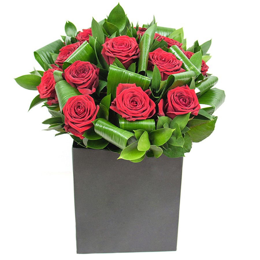 Celebrate elegance with our timeless bouquet, featuring classic red roses, vibrant aspidistra leaves, and delicate ruscus. This unique floral design complements any home décor.