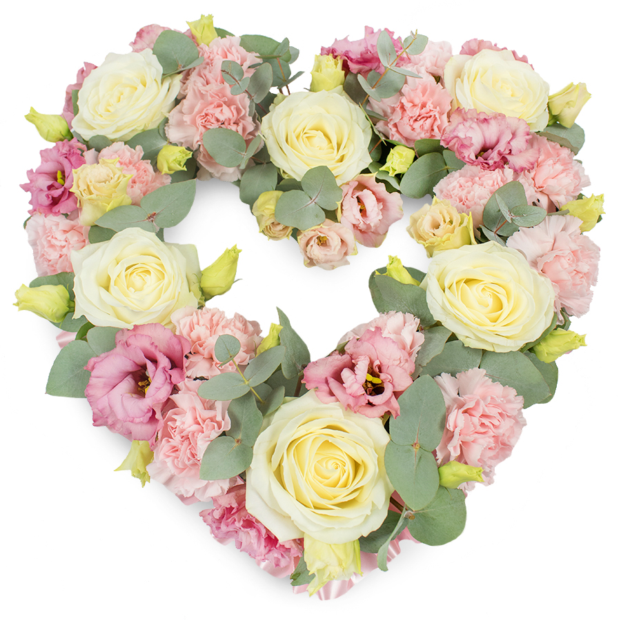 Our Delicate Open Heart Floral Arrangement is a beautiful way to honor cherished memories. Featuring a harmonious mix of white roses, pink carnations, pink lisianthus, and eucalyptus leaves, this bouquet exudes grace and beauty.